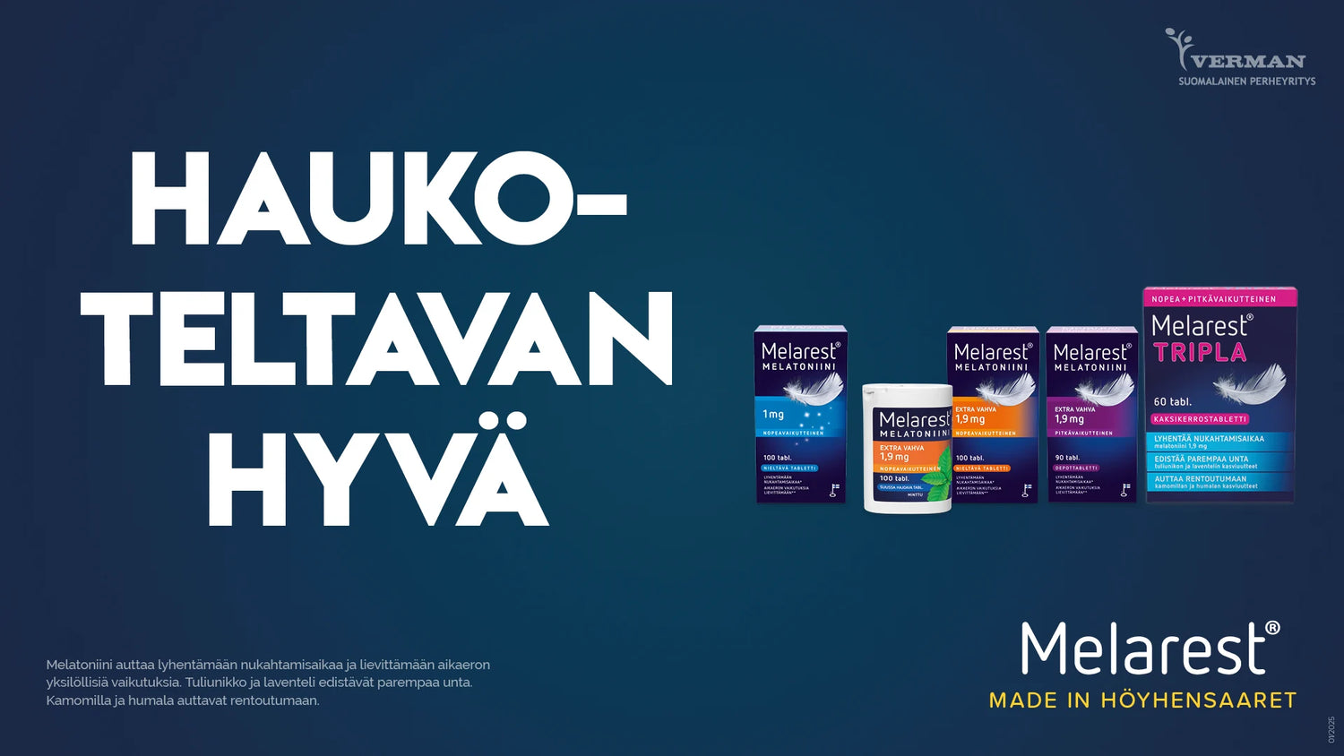 Melarest-melatoniinivalmisteet laadukkaan unen tueksi. Tutustu tabletteihin, suussa hajoaviin vaihtoehtoihin ja yhdistelmävalmisteisiin.