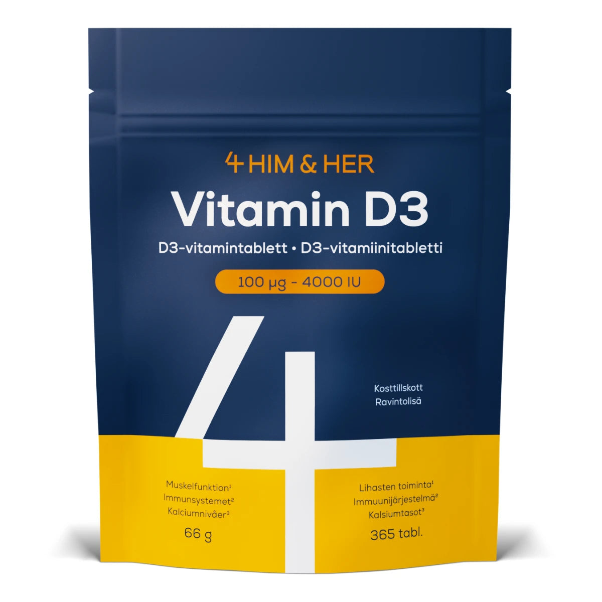 4 HIM & HER D3-vitamiini 100 µg on vahva ja helppokäyttöinen ravintolisä, joka tarjoaa 100 mikrogrammaa D3-vitamiinia (kolekalsiferolia) yhdessä tabletissa. Valmiste soveltuu aikuisille pitkäaikaiseen päivittäiseen käyttöön, kun D-vitamiinin tarve on kohonnut.