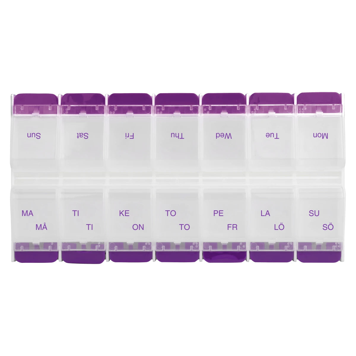 Lääkeannostelija tableteille ja kapseleille, jossa kaksi lokeroa kullekin viikon päivälle. Lokerikon kansissa helposti luettavat merkinnät viikonpäiville kolmella eri kielellä.