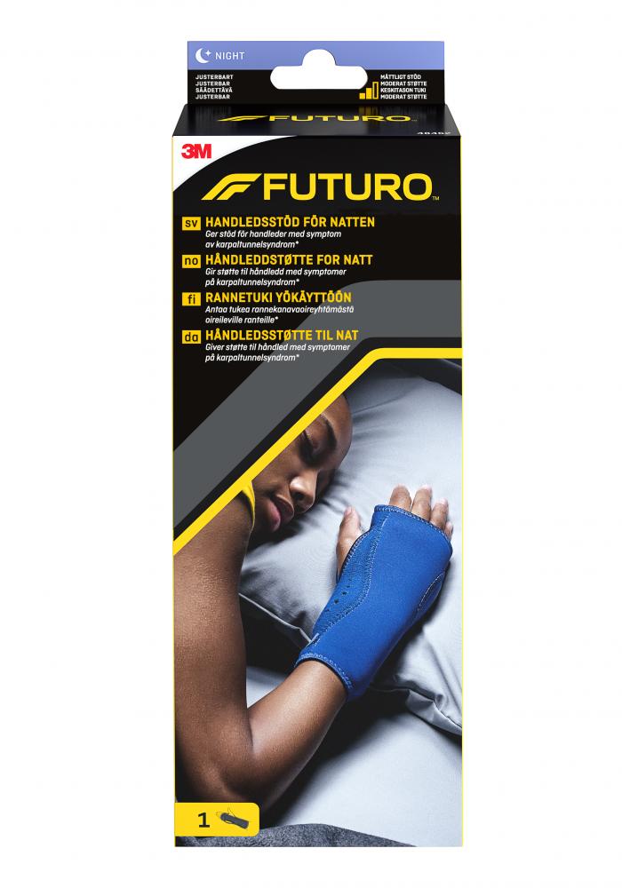 Harjatusta tekstiilistä valmistettu FUTURO™ Night -rannetuki antaa loukkaantuneelle ranteelle pehmeän ja säädettävän tuen. Mukavat helmipehmusteet ovat käden kämmenpuolella pitämässä kättä neutraalissa asennossa, ja kätevä rakenne mahdollistaa helpon kiinnityksen ja nopean siirtymisen unien maille.