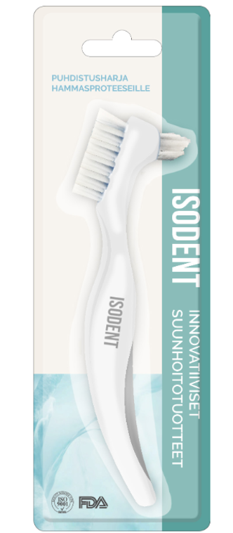 IsoDent-puhdistusharja hammasproteeseille puhdistaa tehokkaasti tuuhealla harjasosallaan. IsoDent-puhdistusharja sopii kaikille hammasproteeseille ja se pysyy hyvin kädessäsi ergonomisesti suunnitellun kahvansa pehmustetun liukuesteen ansiosta. IsoDent-puhdistusharjan kärkiharja puhdistaa ahtaat osat leikiten. Harjaksien vahva ja kestävä nailon ei vahingoita herkän proteesin pintaa.