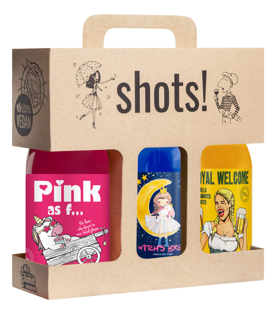 Kolmen luonnollisen ja vegaanisen suihkugeelin lahja-/tervetuliaispakkaus. Pakkauksessa pinkki, tummansininen ja keltainen suihkugeeli.