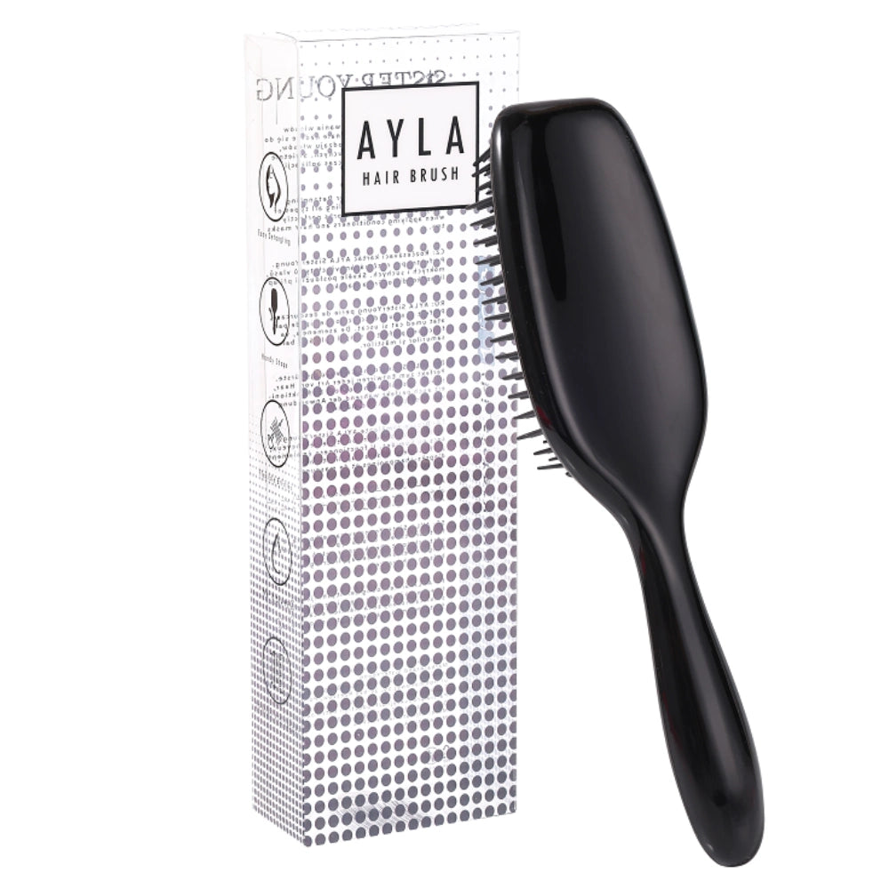 AYLA BLACK -selvitysharjassa on pehmeät ja joustavat harjakset. Toimiva pakkaus upealla designilla on täydellinen lahja toiselle tai itsellesi. Sopii kaikenlaisille hiuksille, erityisesti märille ja herkille.