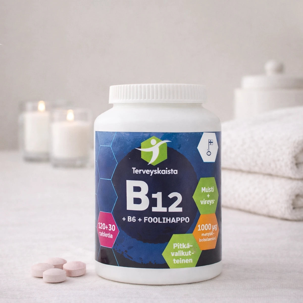 Käyttötarkoitus:B12-vitamiini edistää hermoston normaalia toimintaa. B12-vitamiinia tarvitaan foolihapon muuttamiseen kehossa aktiiviseen muotoon – yhdessä nämä vitamiinit suojaavat aivoja ja hermostoa.