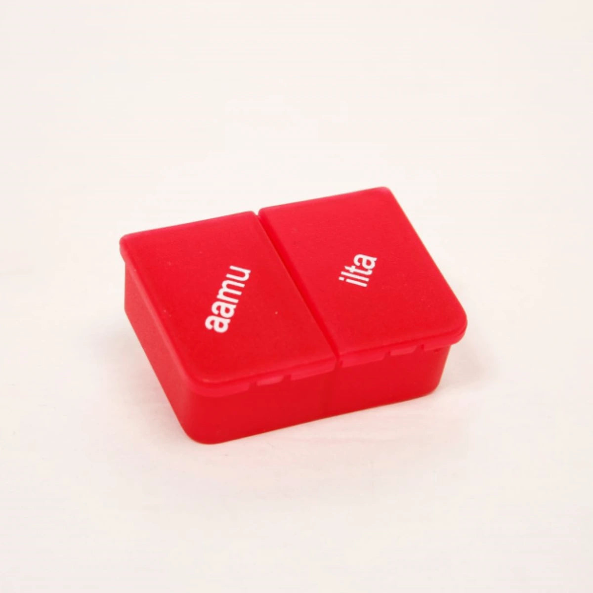Lääkedosetti, jossa tilavat aamu-iltalokerot yhdelle päivälle. Dosetin saa avattua nostamalla luukkua kevyesti alhaalta ylöspäin.